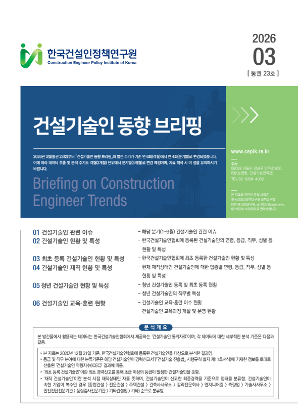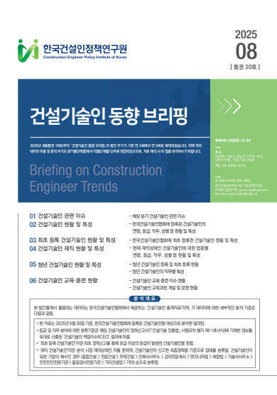 연구원 소식 건설기술인 교육·훈련 제도 개선을 위한 세미나 개최 2026.01.29 더보기 연구원 소식 [2025 한국건축문화대상] 유튜브로 대중과 건축간 다리 놓다 2025.11.07 더보기 연구원 소식 [위기의 건설, 지혜를 묻다] 김경식 전 국토교통부 1차관 2025.07.21 더보기 연구원 소식 건썰의시대 - 채널A 6월 28일(토) 11시 첫방송 2025.06.28 더보기 Previous Next Pause Play 건설기술인 동향브리핑 건설기술인 동향 브리핑 (제23호) 2026.03.06 더보기 건설기술인 동향브리핑 건설기술인 동향 브리핑 (제22호) 2026.01.09 더보기 건설기술인 동향브리핑 건설기술인 동향 브리핑 (제21호) 2025.11.24 더보기 건설기술인 동향브리핑 건설기술인 동향 브리핑 (제20호) 2025.09.01 더보기 건설기술인 동향브리핑 건설기술인 동향 브리핑 (제19호) 2025.06.30 더보기 Previous Next Pause Play 건설기술인 동향 건설기술인 동향 브리핑 (제23호) 2026.03.06 건설기술인 동향 브리핑 (제22호) 2026.01.09 건설기술인 동향 브리핑 (제21호) 2025.11.24 건설기술인 동향 브리핑 (제20호) 2025.09.01 more 연구원 보고서 미래 건설기술인 확보를 위한 건설산업 이미지 개선사업 발굴 2025.09.08 건설기술인 해외경력(학력, 실무경력, 자격증) 등록(신고) 개선방안 연구 2025.03.20 중장년층 건설기술인의 디지털 기술 역량 수준 분석 및 강화 방안 2024.10.15 글로벌 건설경쟁력을 위한 고부가가치 전문분야 발굴 및 전문가 양성 방안 연구 2024.10.14 more CEPIK Insight 경력신고 디지털 전환을 위한 온라인 신고 활성화 방안 마련 2025.03.31 건설기술인 통계 관리체계 개선 방안 연구 2025.03.31 건설관련자격 추가 인정을 통한 건설기술인 유입 확대 방안 2025.03.20 건설기술인 특성별 임금 및 근로실태 조사 2025.03.20 more 연구원 소식read more [이사회] 2026년 제1회 정기이사회 개최 2026.02.13 건설기술인 교육·훈련 제도 개선을 위한 세미나 개최 2026.01.29 [채용] 교육행정직(경력직) 채용공고 2025.12.10 [이사회] 2025년 제2회 정기이사회 개최 2025.11.26 보도자료read more [보도자료] 건설업계 '통제' 중심 조직문화 유형, 수급 불균형 촉진 외 1건 2026.02.19 [보도자료] 한국건설인정책연구원, '건설기술인 교육·훈련 제도 개선 세미나' 성료 2026.02.03 [보도자료] 한국건설인정책연구원, 건설기술인 교육·훈련 제도 개선 세미나 2월 3일 개최 2026.01.29 [보도자료] 건설기술인 교육, 판도 확 바뀌었다 2025.12.15
