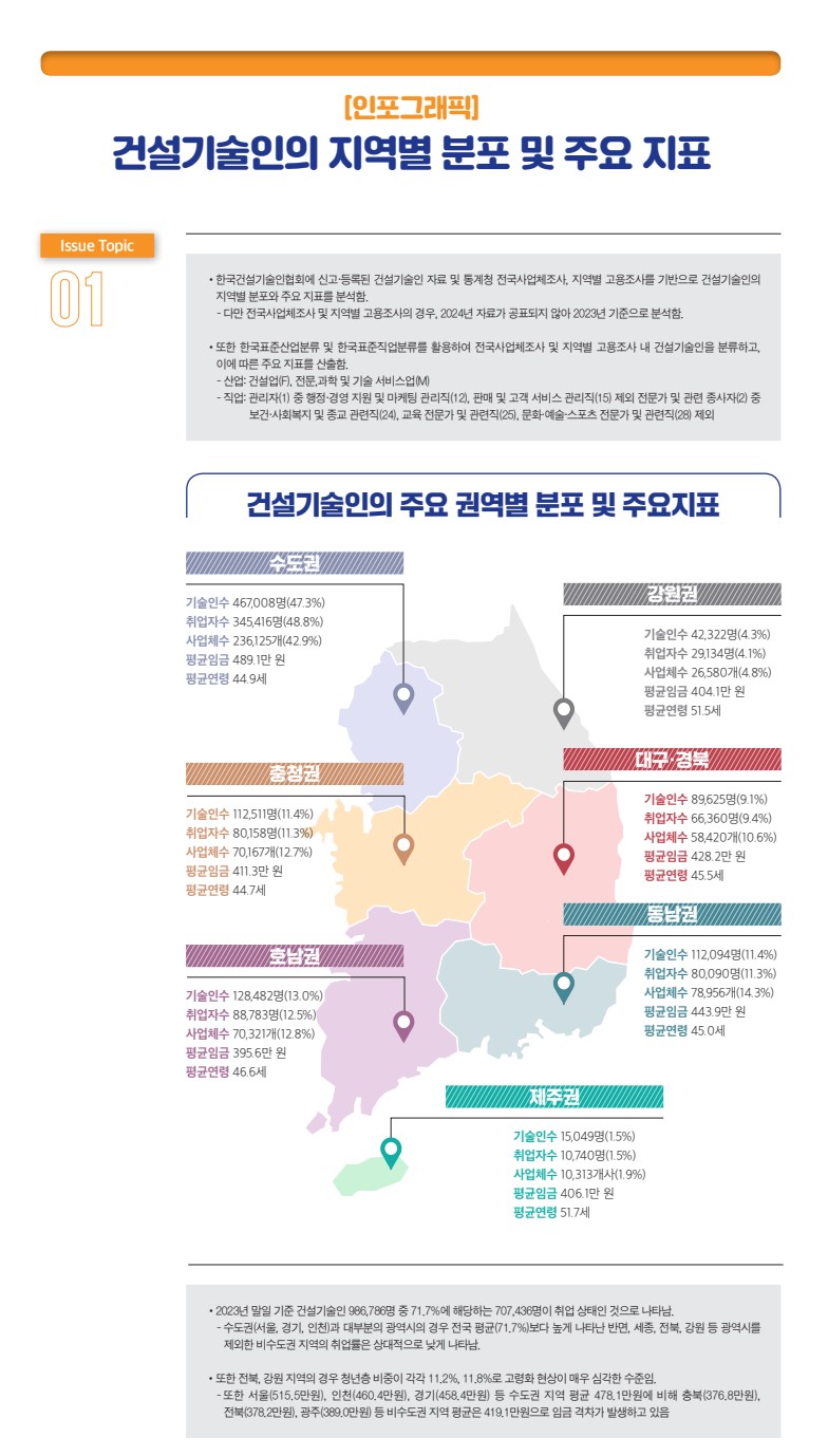 건설기술인의 지역별 분포 및 주요 지표