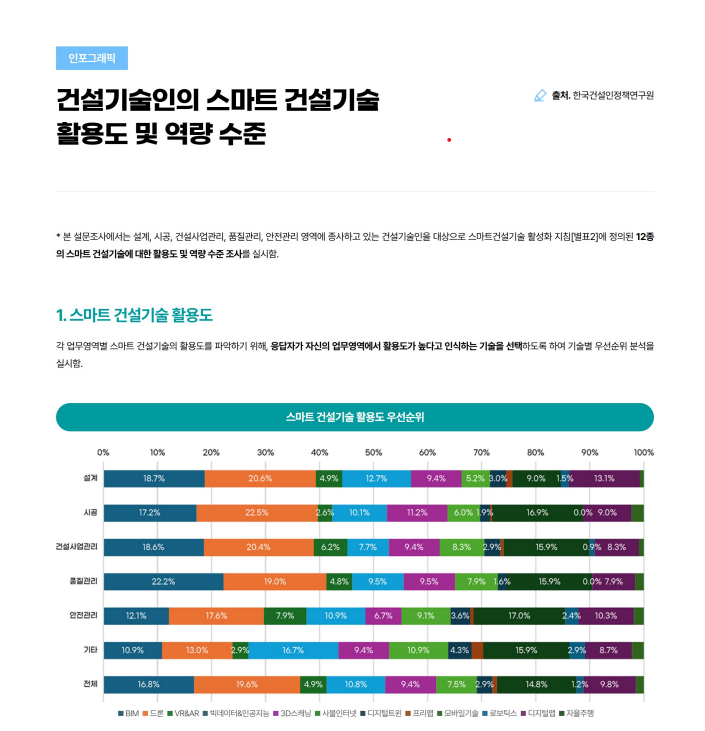 건설산업 및 건설기술인과 관련된 각종 통계, 설문조사, 변화추이 등의 정보를 그래픽으로 나타낸 자료입니다.